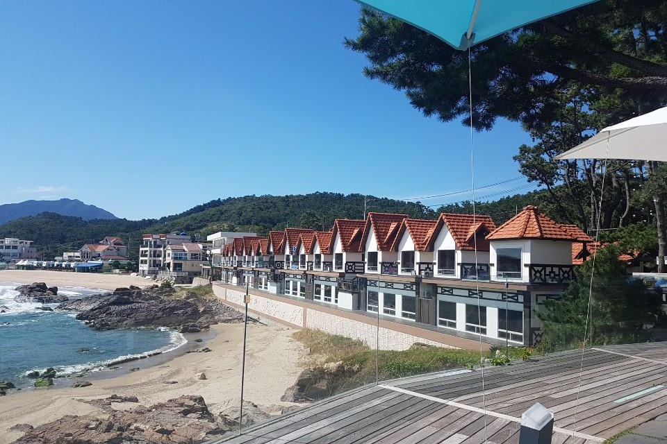 주황색 지붕으로 된 저곳이 별채 공간입니다 웨이브온은 기장. 임랑해수욕장 앞에 있는 커피숍인데 저 주황색 지붕은 제가 어릴 적 임랑해수욕장에 놀러 왔을 때도 있었던 곳이었습니다 그러니까 저곳을 웨이브온에서 인수해서 운영을 하고 있는 것 같습니다 별채로 가시면 1층에서는 식사를 할 수 있는 곳이고 2층은 카페에서 테이크 아웃해온 커피를 가지고 와서 음료를 마시며 쉬면서 이용하실 수 있는 별도의 공간입니다