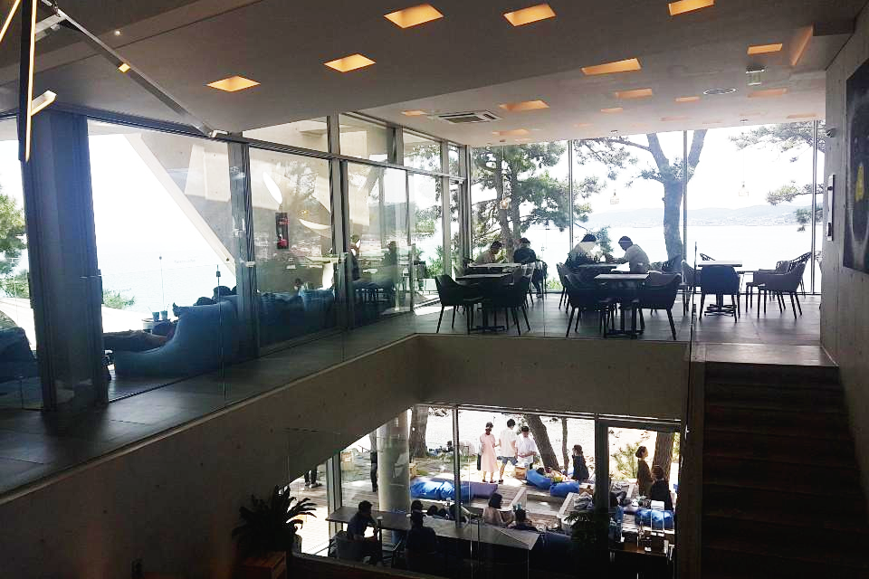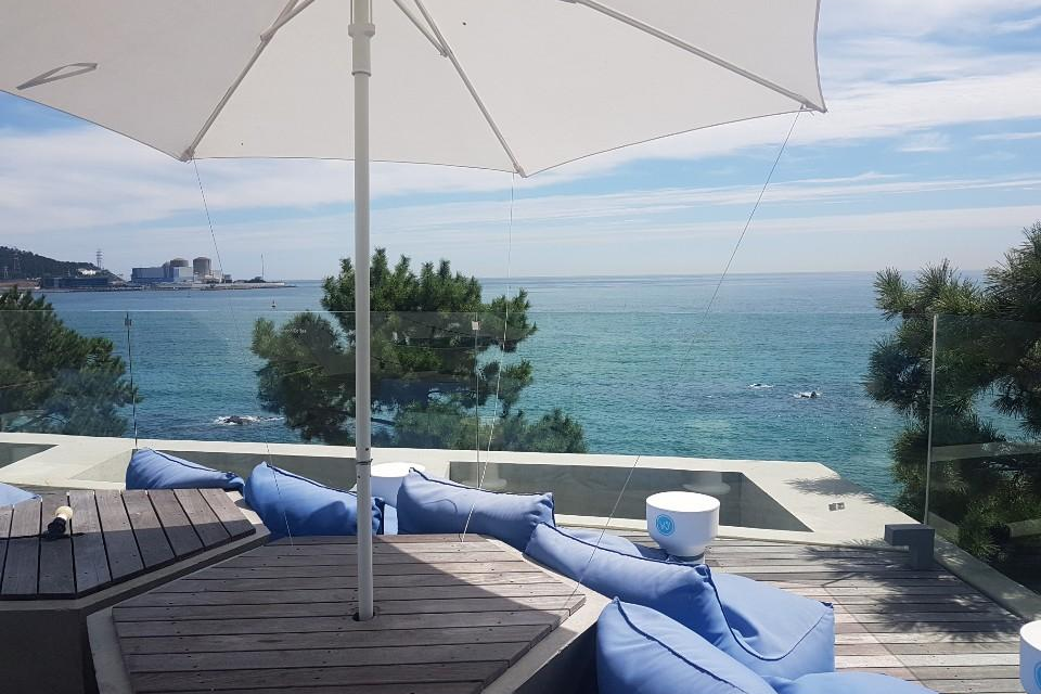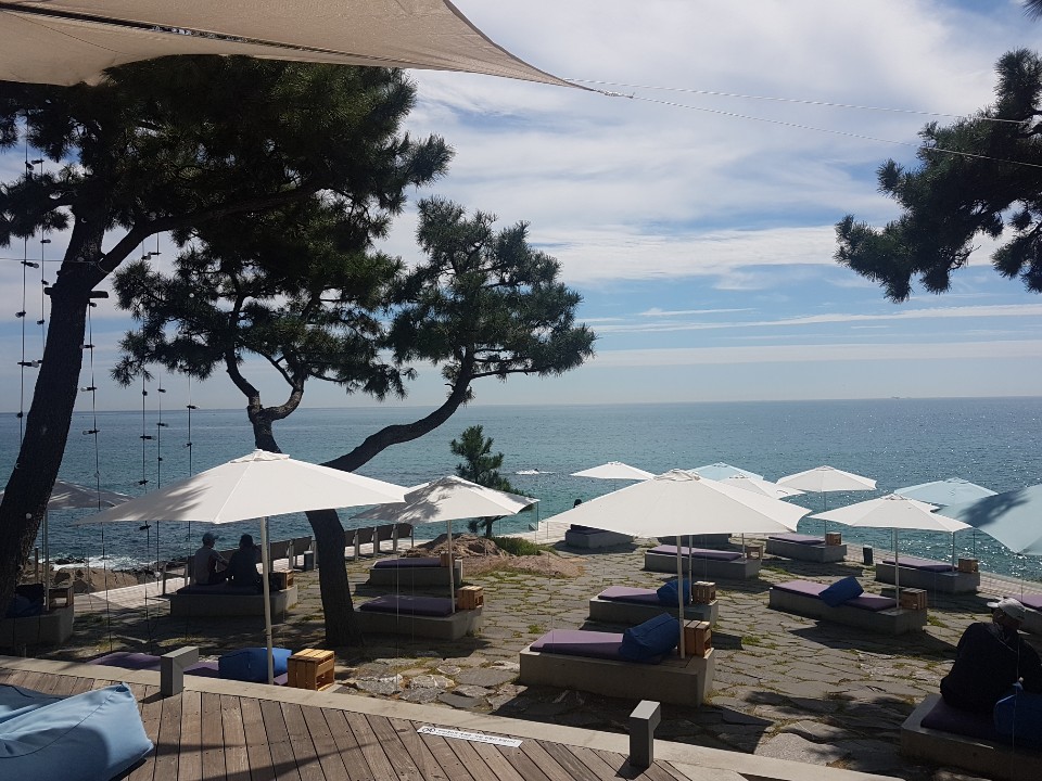 먼저 야외로 나가 보았습니다 끝없이 펼쳐진 바다를 바라보며 마시는 커피한잔 끝내줄 것 같지만 생각보다 햇살이 너무 따갑습니다 그래도 야외를 이용하시는 분들이 꽤 많이 계셨습니다