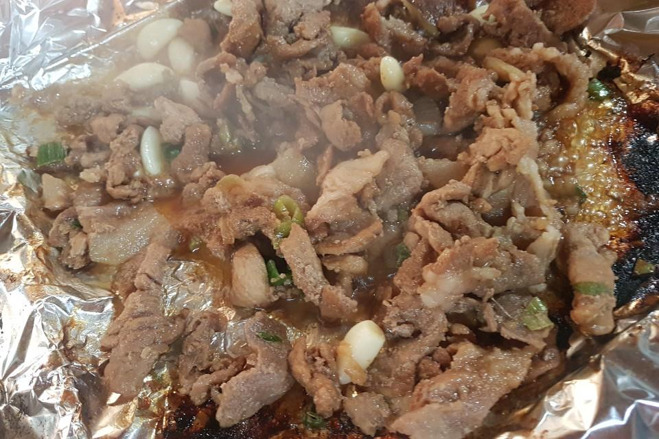 고기는 셀프로 살짝 뒤집어 주면서 드시면 됩니다 핏기가 보이지 않게 고기가 익으면 드시면 되고 초딩입맛인 저는 살짝 호이일 탔을 때 더 맛있게 느껴졌어요 고기 양념은 많이 자극적이지 않은 편이고 상추에 파무침과 함께 싸 먹으니 정말 꿀맛입니다