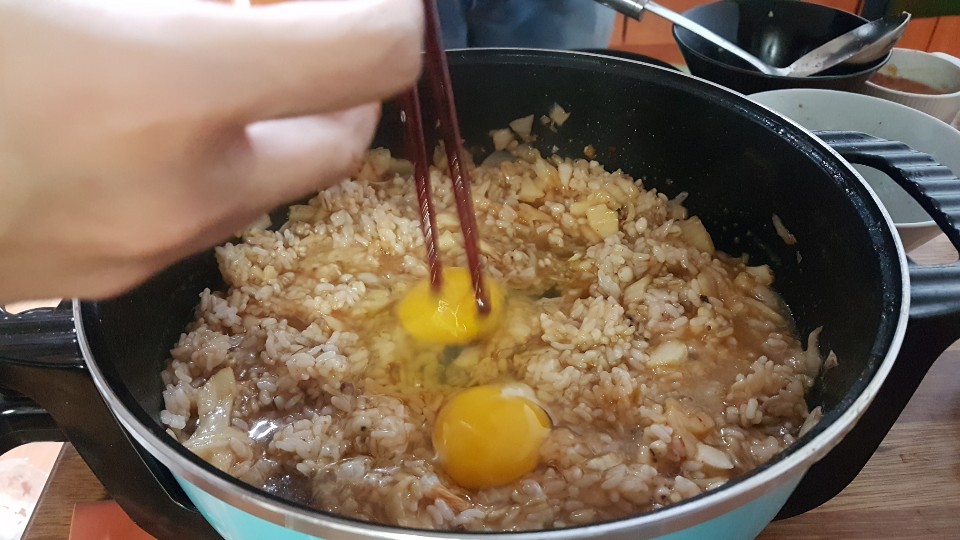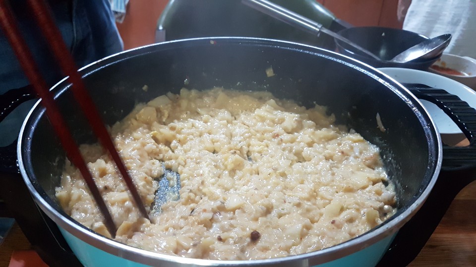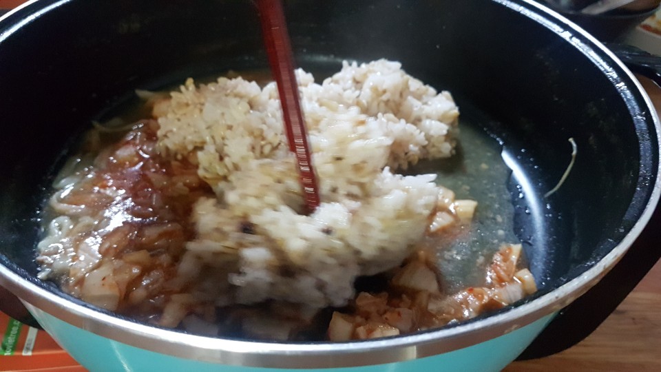 마지막에 죽을 먹어야 했기때문입니다 잘익은 김치를 넣고 (육수는 어느정도 남겨두셔야 합니다 )