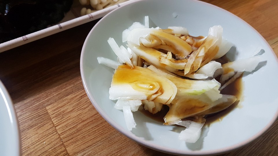 칠리소스를 앞접시에 따로 답고 찍어먹는 소스는 양파슬라이스와 함께 버무려 두었습니다