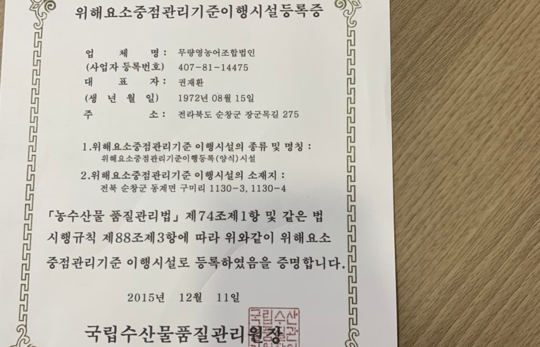 위해요소 중점관리기준 이행시설로 등록증이 걸려있었습니다 그리고 섬진강변에 장어양식장이 있는데 양식장에서 미생물을 ㅂ양해서 장어를 키운다고 합니다 화학약품이 단 한방울만 들어가도 미생물이 전멸해 버리기 때문에 화학약품을 사용한다는건 양시장이 폭망하는 지름길이라이라고 합니다 서산맛집 청미짚불장어의 장어는 화학약품을 사용하지 않고 국립수산물 관리원에서 매년 실지하는 정기검사에서 적합판정을 받고 있으니 안심하고 먹어도 된다고 하네요