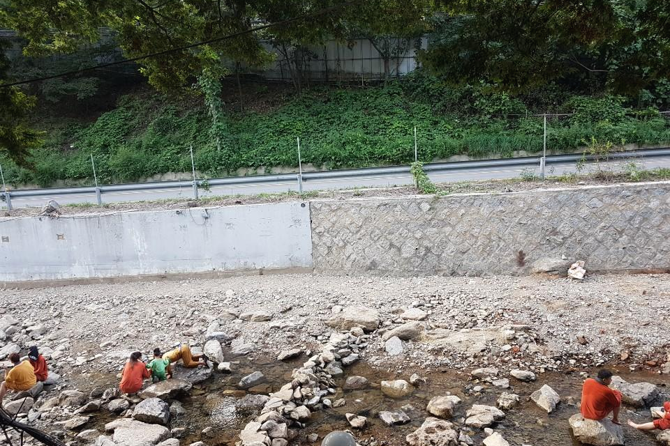 계곡은 물이 다빠져 있었습니다 그래도 발담그고 있기는 좋았습니다 방송에서 나온모습은 성인도 풍덩 들어갈수 있는 정도의 깊이 였는데 그때는 인공적으로 물을 끌어다 와서 만든 것이었다고 합니다