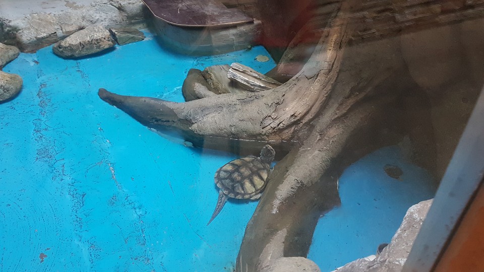 늑대거북입니다 거북이를 물속에서 만나지 못하고 이렇게 유리너머로 보니 왠지 측은한 마음이 들었네요 늑대거북은 날카롱ㄴ 턱을 이용하여 입에 들어가는 것은 무엇이든 닥치는 대로 먹어치우는 무서운 녀석이라고 합니다