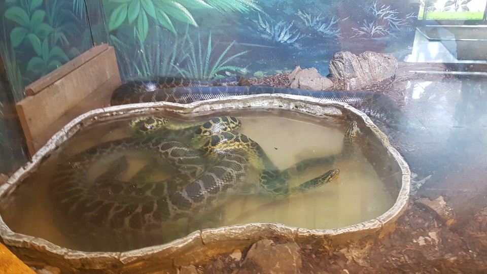 노랑아나콘다입니다 세계에서 가장 큰 뱀 답게 크기가 무시무시하네요 아나콘다는 독은 없지만 먹이를 만나면 졸라서 질식시킨후 한입게 삼켜버린다고 합니다
