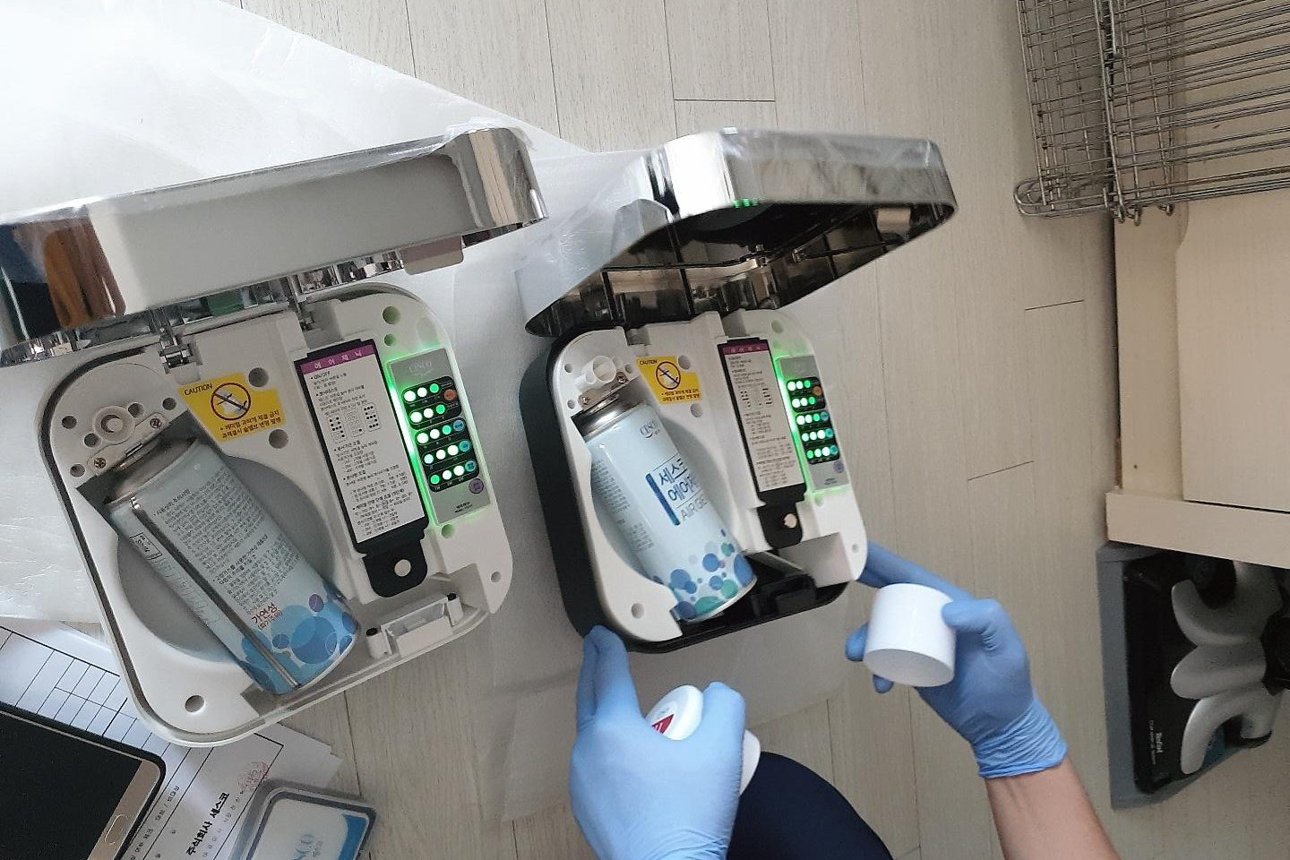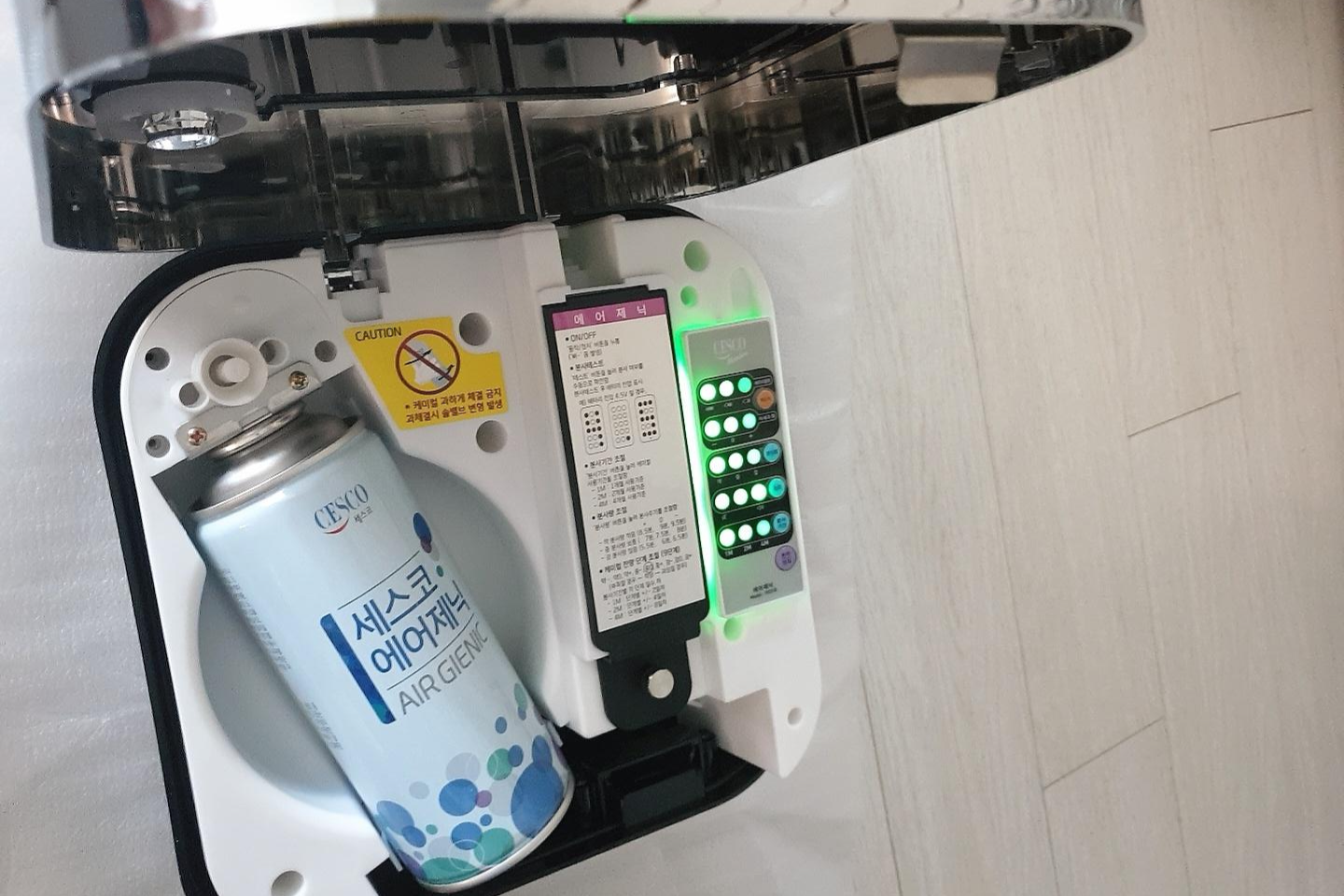 향기는 시향 후 선택이 가능합니다 향을 맡아 보고 고르겠다고 요청 하시면 세가지 정도 인기 있는 향을 가지고 오십니다 본체 속에 넣는 일반 방향제통이랑 다르지 않게 생겼지만 저통에서 분사되는 향이 대장균 황색포도상구균등 악취발생 원인세균을 99% 이상 제거하는 기능을 한다고 하는데 무척이나 기대가 됩니다