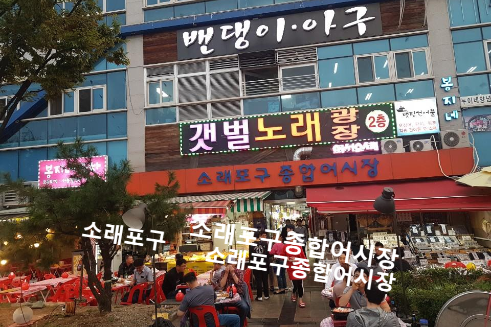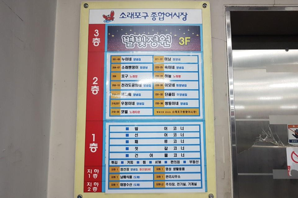 소래포구 종합어시시장은 지하 1층 지하2층은 주차장 1층은 종합어시장 2층은 일반음식점, 노래방 3층은 야외공원으로 이루어져 있습니다