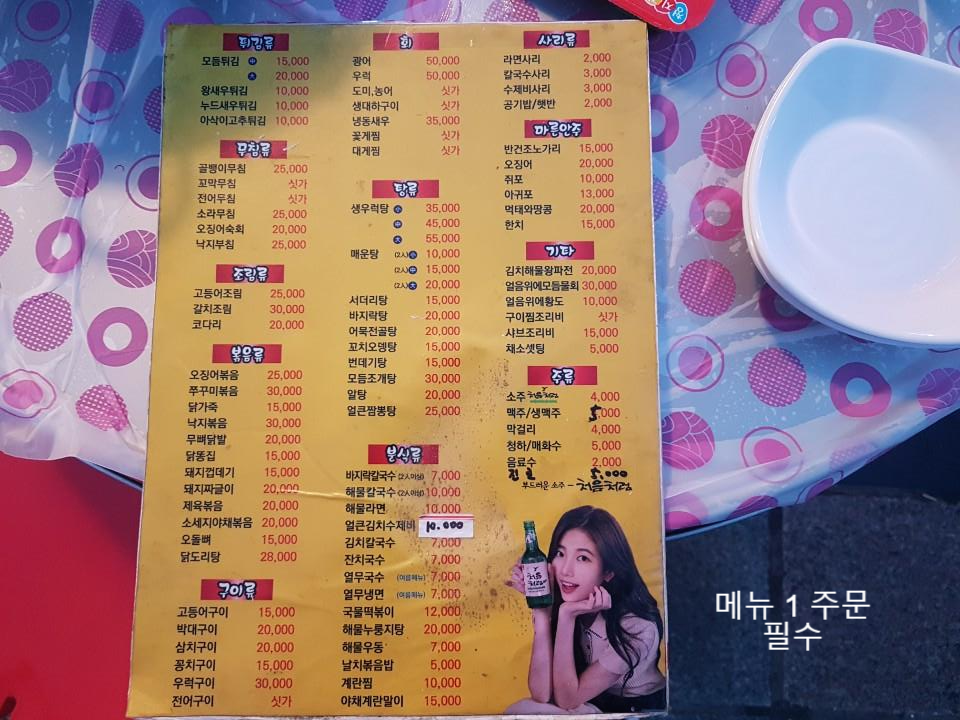 저희가 앉은 노상자리는 분식집이었는데 메뉴가 생각보다 많았습니다 많은데 별로 시킬것이 없어서 많이 고민했습니다 결국 옆테이블이 먹는 해물 칼국수를 주문했습니다