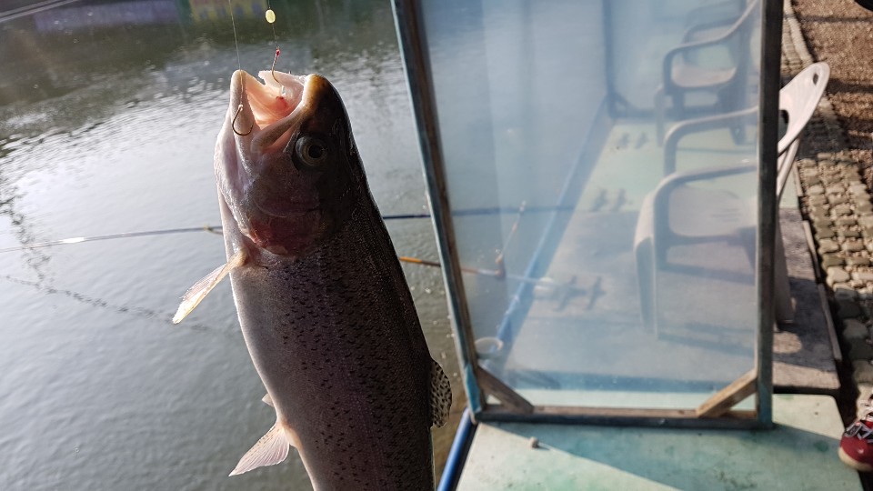처음으로 잡아올린 송어 입니다 낚시 경험이 별로 없긴 하지만 지금까지는 애기 고기만 잡아봐서 낚아 올리는 순간 흥분해서 엄청 소리를 질러댔습니다
