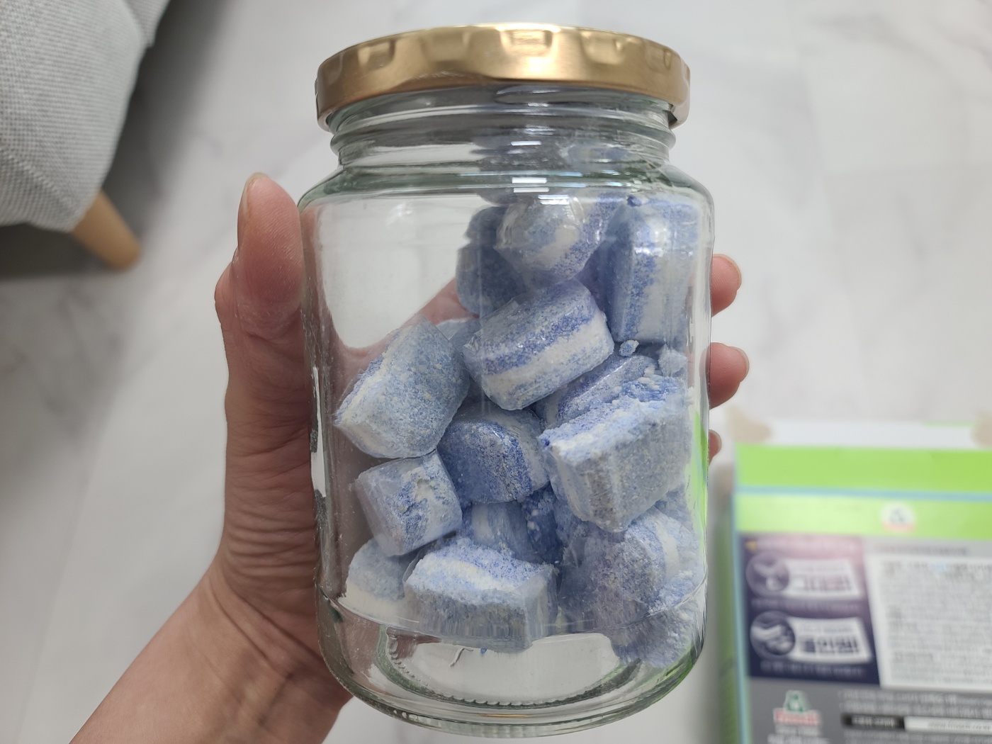 6인용이라서 그릇을 꽉채워 넣어도 세제는 절반만 넣으면 된다기에 반만 잘라서 넣어 주고 있습니다 미리 잘라서 유리병에 담아 두고 쓰고 있습니다