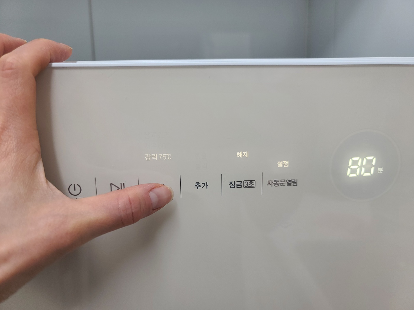 고속세척기능은 없고 열풍건조기능도 없지만 세척하는것에 딱히 불편함이 없이 쓰고 있습니다 전원버튼을 켠뒤 코스를 선택할 수 있고 추가적으로 헹굼과 불림 또 한 추가 할 수 있습니다