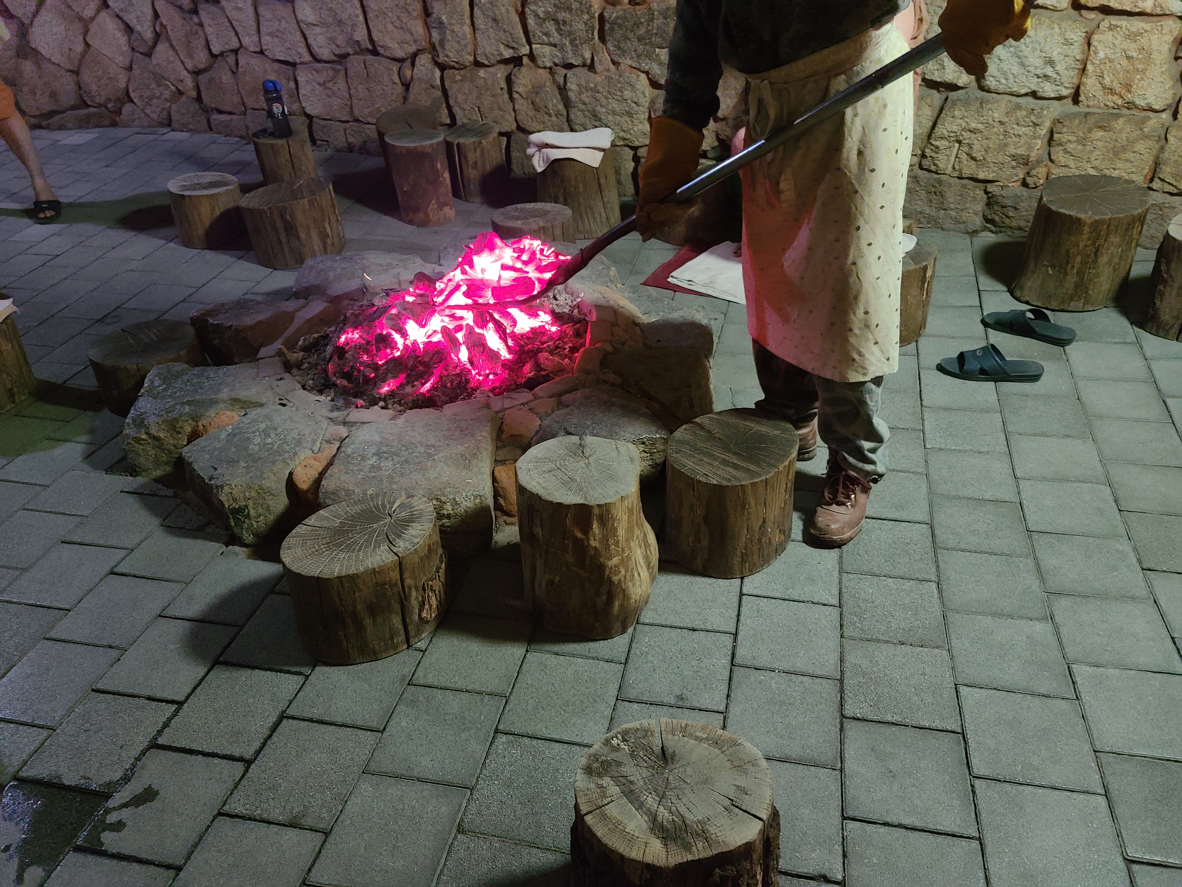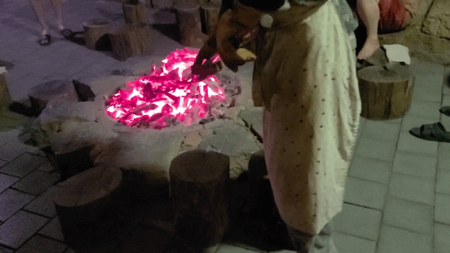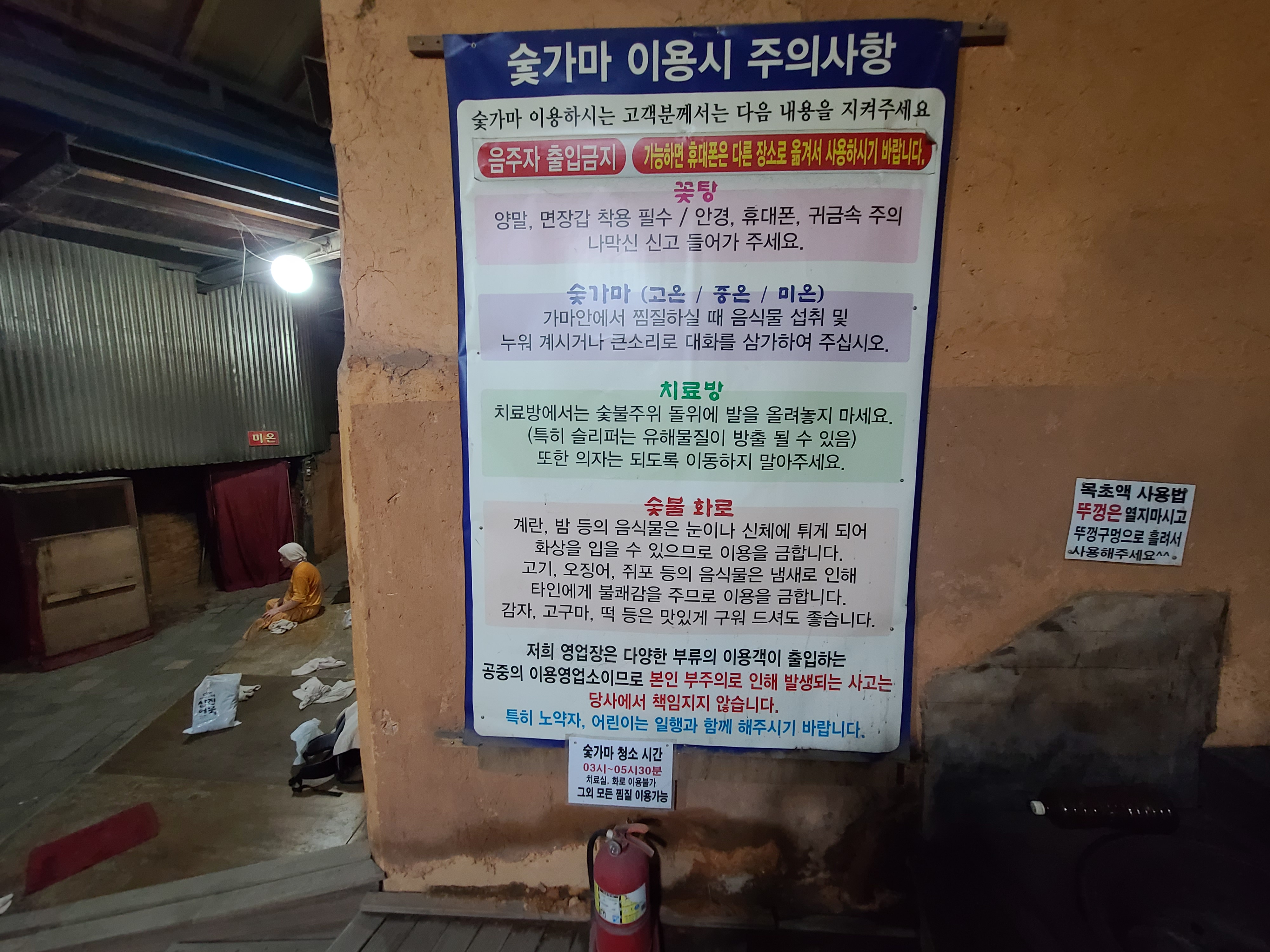 중간에 불을 더 뜨겁게 해주시려고 숯을 리필해 주셨습니다 여기 드나드는 입구쪽이 커튼으로 되어 있기 때문에 입구쪽에 앉으면 힘들지 않게 찜질을 즐기실 수 있습니다