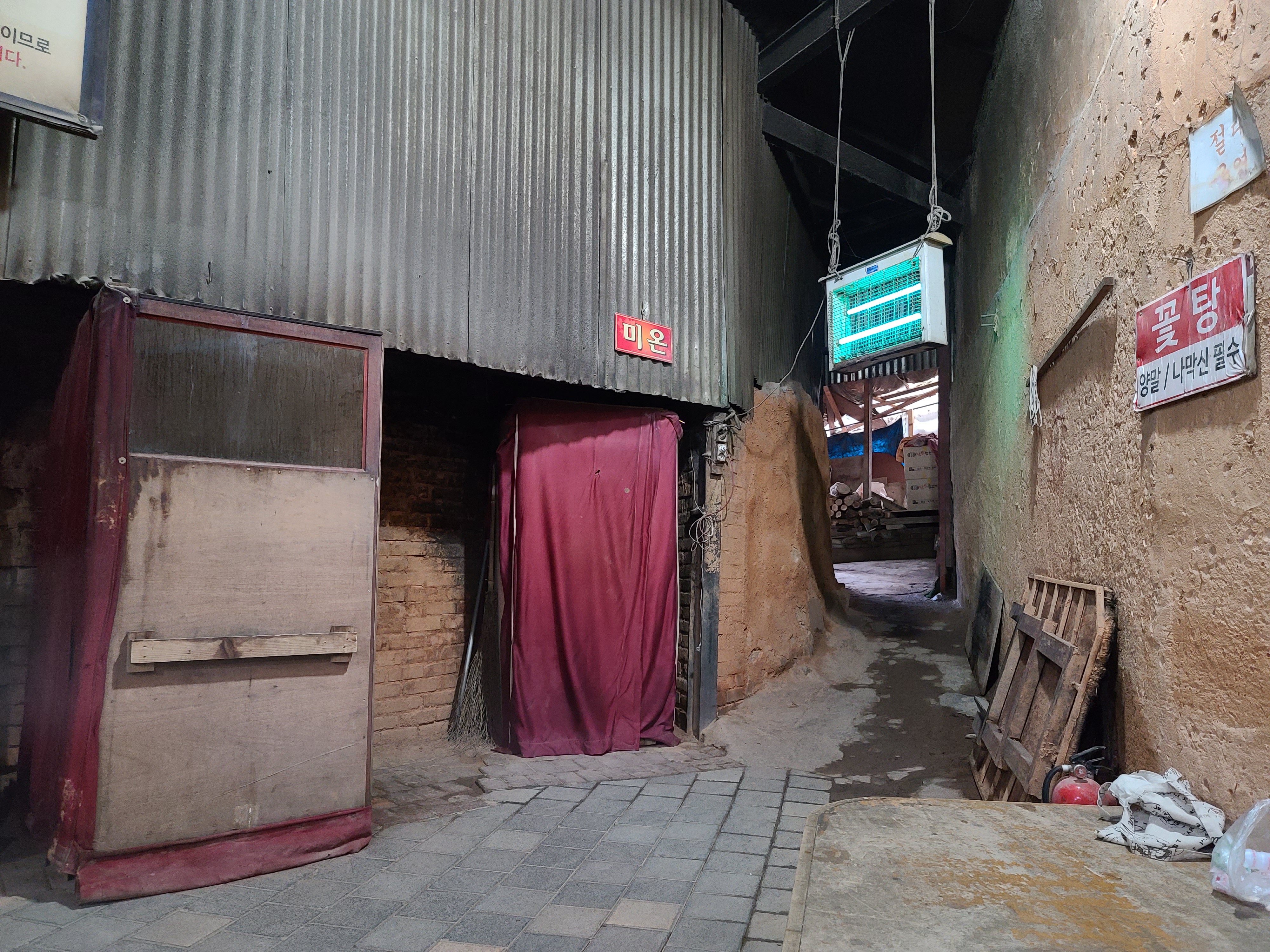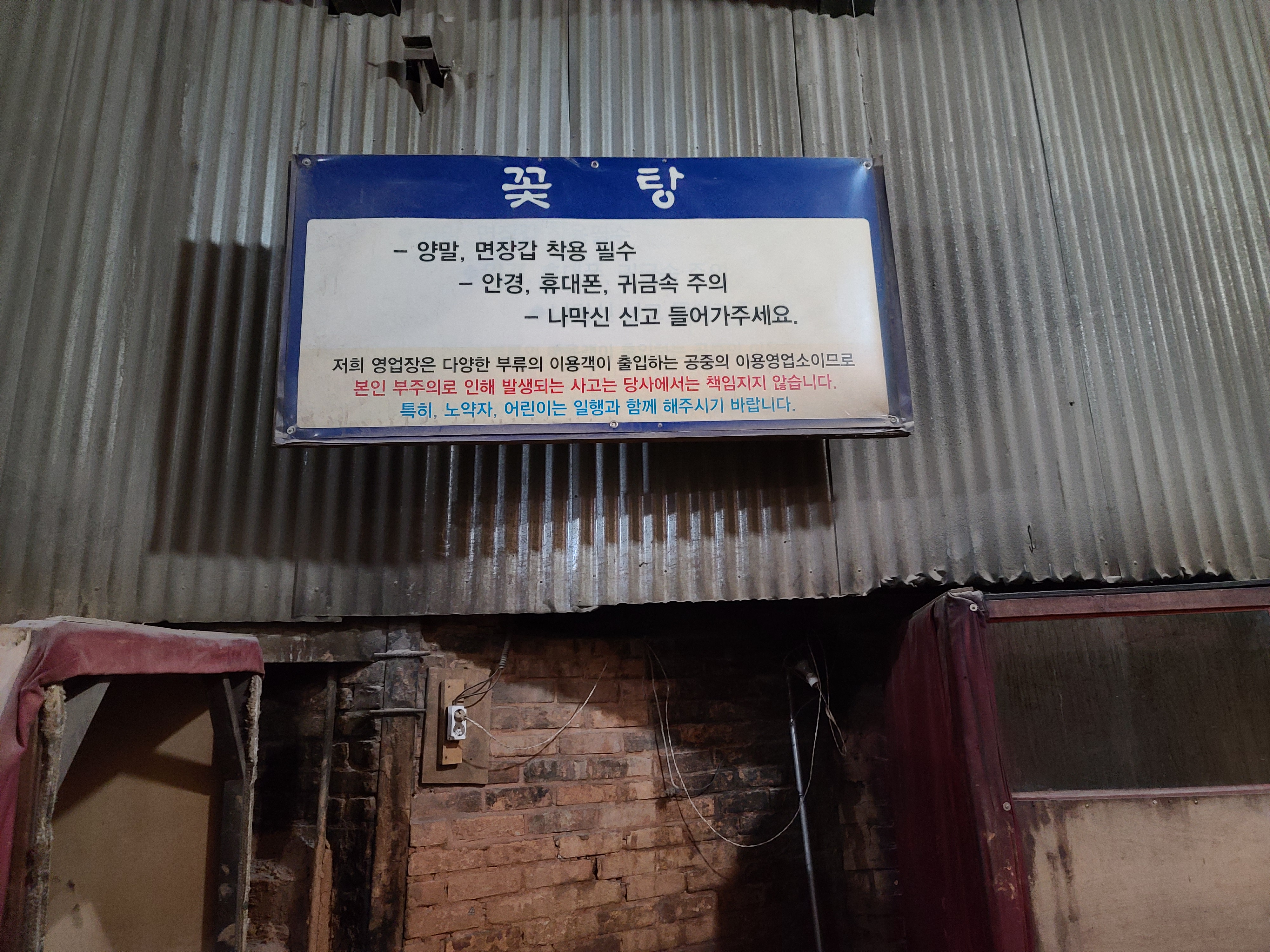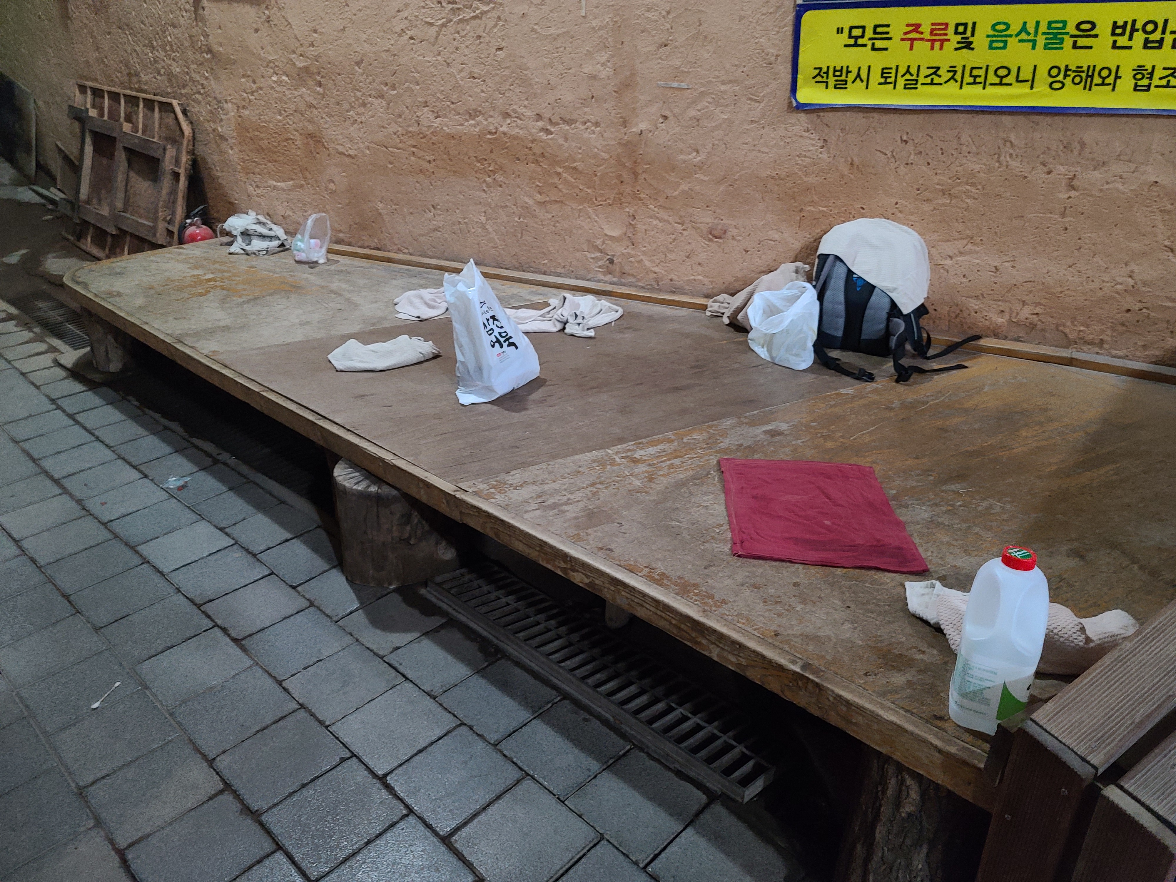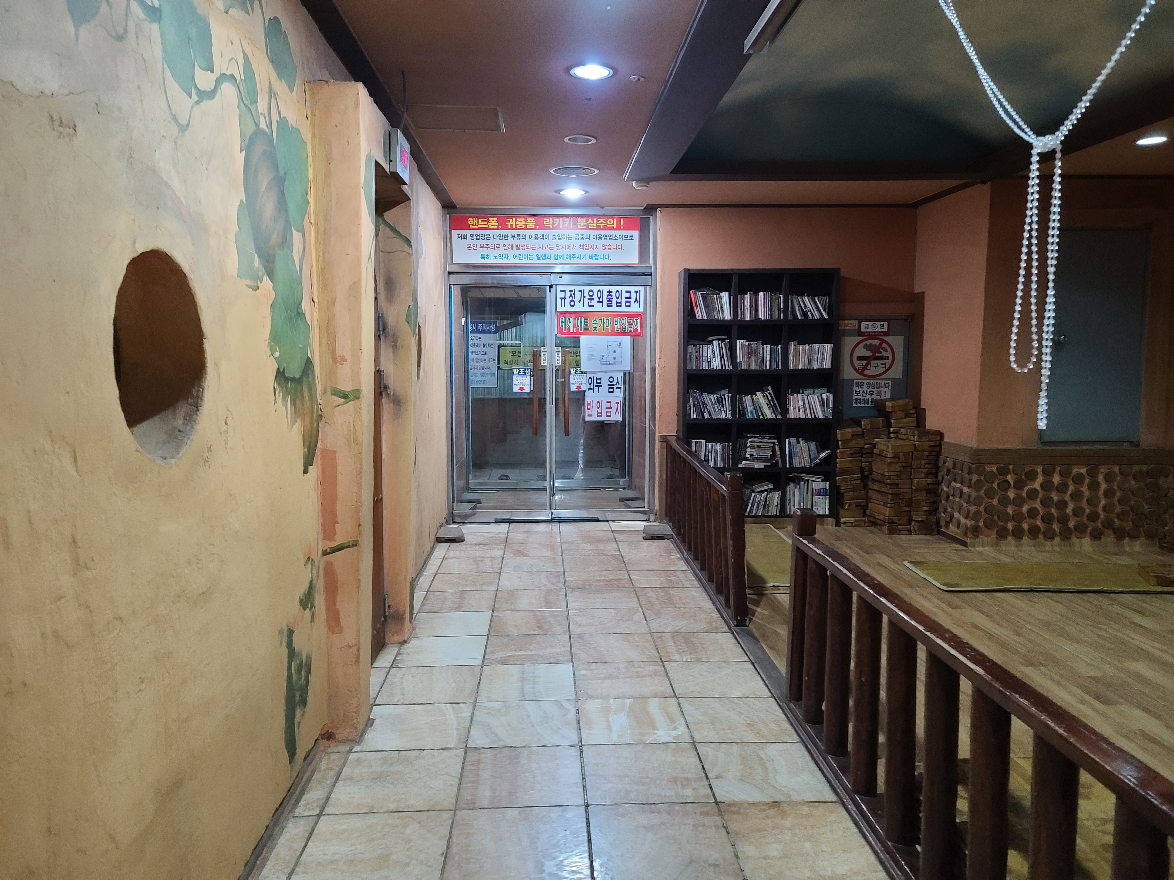 양옆은 끝은 나갈 수 있는 문이 존재하는데 오른쪽 끝은 관계자외 출입금지 이고 왼쪽은 야외에서 땀을 식힐 수 있는 공간입니다 외부에도 평상이 넉넉하게 있어서 좋았습니다