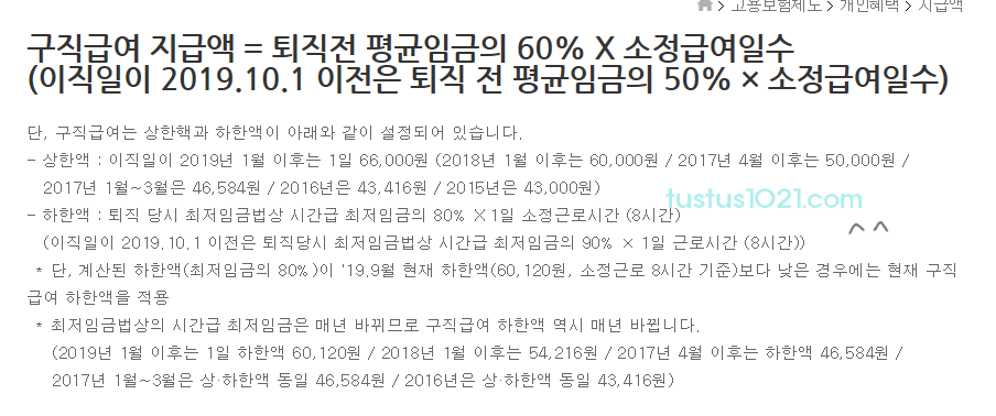 이직일이 2019년 1월 이후인 경우는 1일 최대 66,000원 이며 하한액은 1일 60,120원 입니다. 1일 구직급여 수급액이 최저임금일액의 80% 미만일 경우에는 최저임금일액의 80%로 계산합니다.최저구직급여일액은 고용보헙 가입종료일을 기준으로 당해년도 최저임금일액으로 계산합니다.