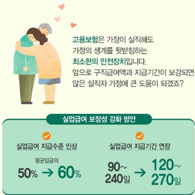 먼저 반가운 소식은 2019년 10월부터 실업급여 지급 기준이 평균임금의 50%에서 60%로 늘었고 수급기간 역시 30일 늘어났습니다. 하지만 나쁜 현실은 경기 침체로 인해 재취업 비율이 25% 정도로 굉장히 낮은 상태라는 것입니다