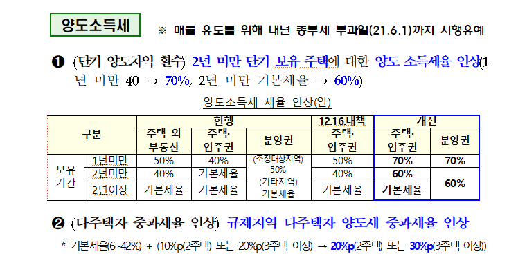 주택 및 조합원 입주권포함 2년내 단기 양도시 세율인상 // 1년미만 (40%→70%) 2년미만 (기본세율→60%)