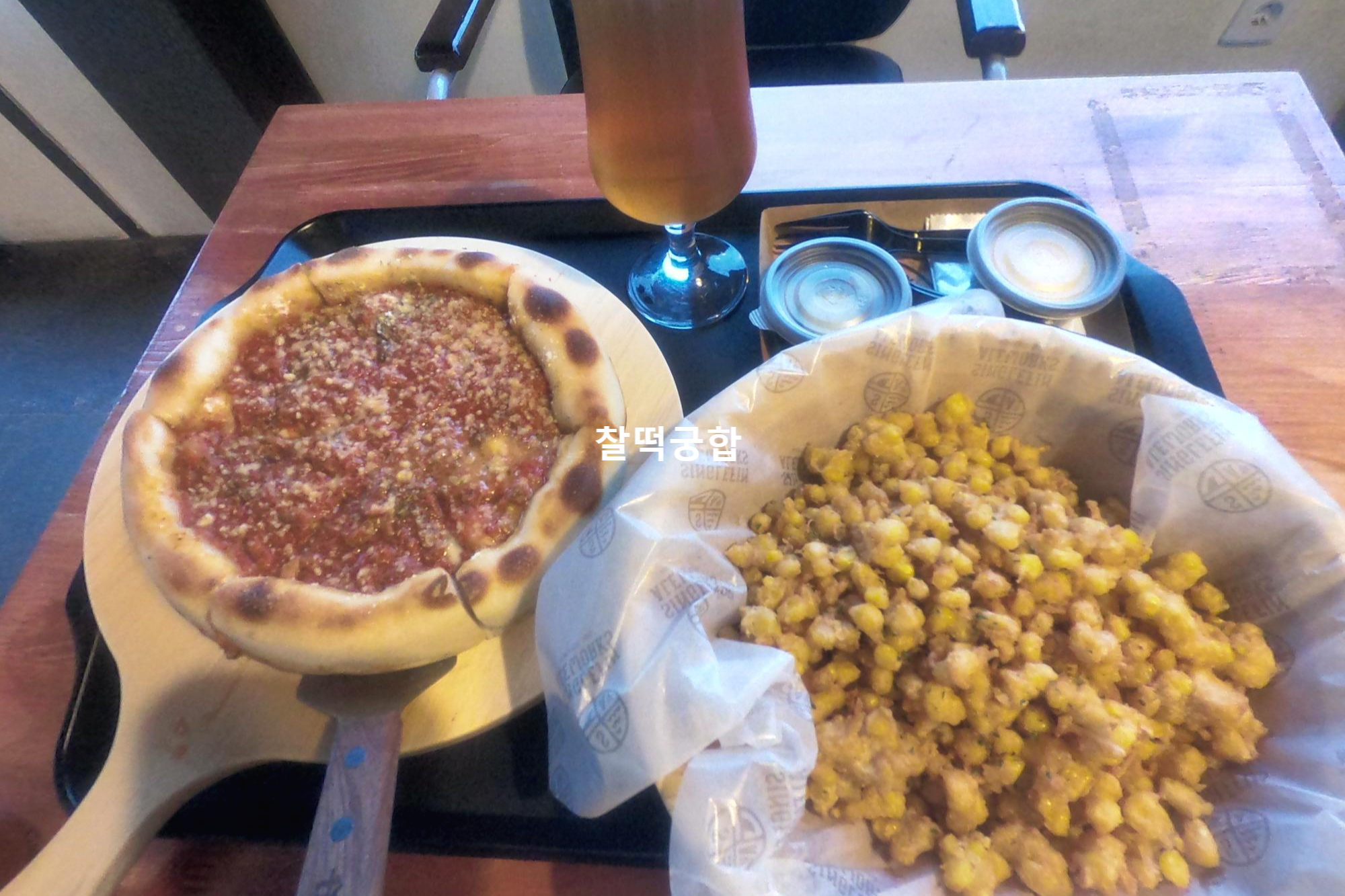 피자가 정말 두툼하고 안에 치즈도 많이 들어있어서 그냥 먹어도 정말 맛있었어요 옥수수알 튀김은 느끼한 걸 좋아하는 분들이라면 입맛에 맞는 그런 맛인데 저는 개인적으로 제가 좋아하는 맛이었습니다 근데 빨리 먹지 않으니 눅눅해져서 다못먹고 남기고 나오고 말았네요 그래도 피자는 마지막 한 조각까지 열심히 다 먹었어요 두꺼워도 부담스럽지 않고 시중에서 배달해먹는 피자랑은 색다른 맛이 만족스러웠습니다