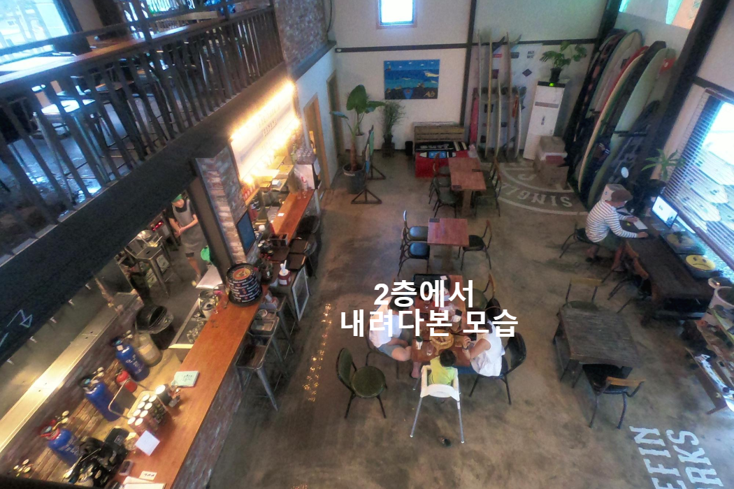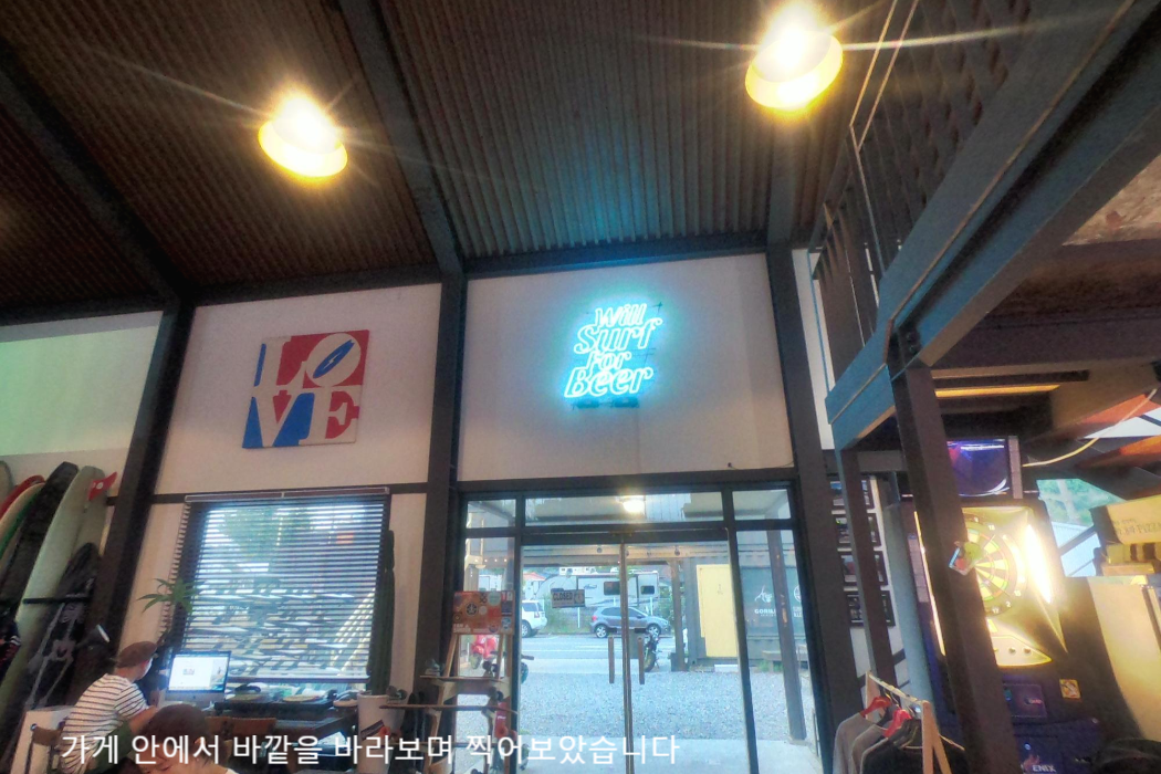 1층에는 제가 좋아하는 다트도 있고 이곳 양양이 서핑의 성지인 만큼 이곳도 서핑보드가 전시되어있고 2층에서 보이는 화면에는 계속 서핑하는 영상이 나왔습니다 1층에서 컴퓨터 작업하시는 분은 아마 서핑 강습 사진을 업로드해주고 계신 것 같았어요 아마 가게 운영과 서핑 강습 샵도 같이 운영하시는 것 같네요