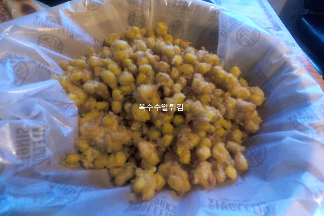 그래서 피자도 추천추천 물어보고 주문을 했어요 그리고 사이드는 옥수수알 튀김을 먹었는데 요건 다른 블로거 분께서 엄청 맛있다고 개인적인 취향이고 가게에서 무상제공받은 것도 아니고 그냥 본인이 너무 좋아해서 매일매일 먹고 싶다고 써둔 분이 계셔서 엄청 궁금해서 고민 없이 시켰답니다