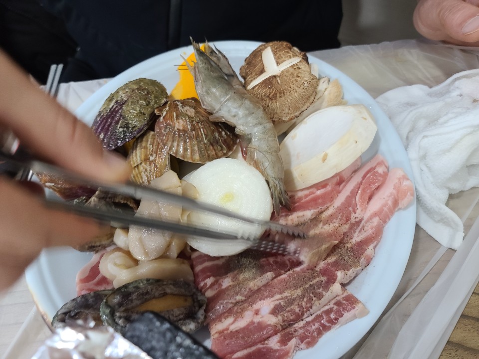 그리고 접시에 담겨져 나온 삼겹살 조개 새우 전복등등등