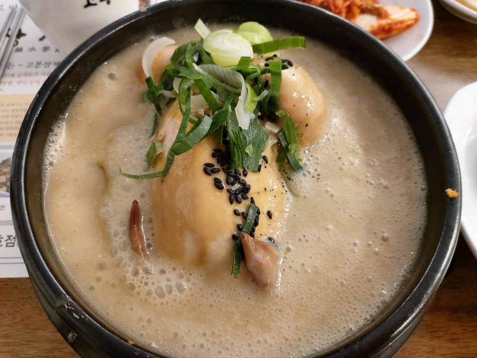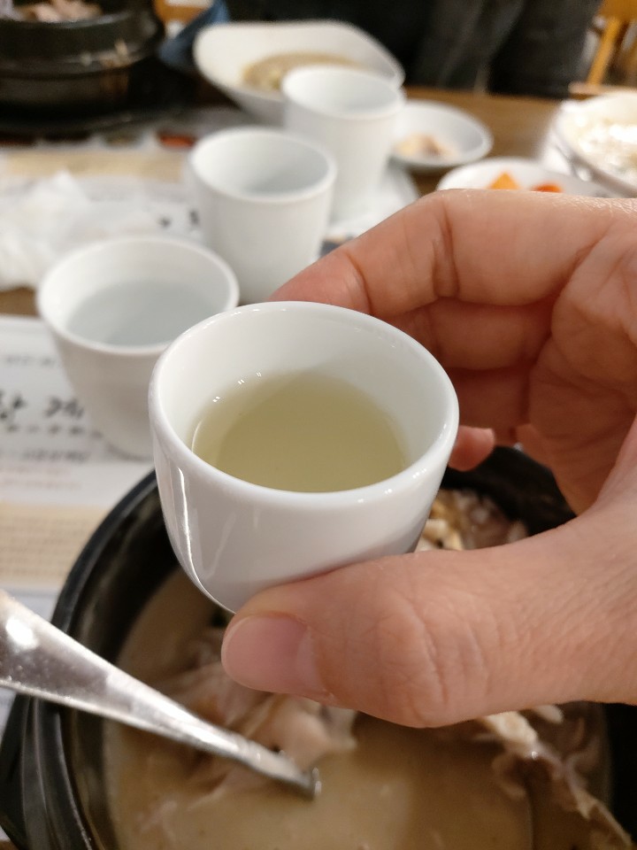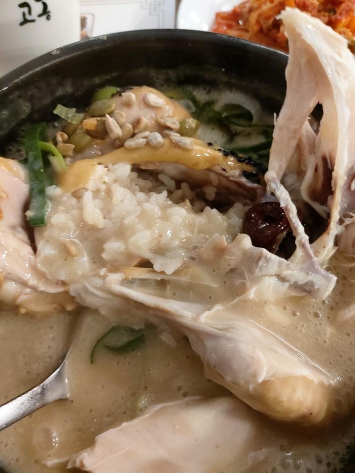 국물이 보시는 바와같이 아주 농도가 있어 보입니다 간혹 진해 보이는 국물도 먹으면 밍밍한 경우가 더러 있었는데 국물이 보이는 것처럼 아주 찐득한 느낌이었습니다 개인적으로 아주 맛있었습니다 삼계탕에 맑은 국물을 좋아하는 분이라면 싫어하실 수도 있겠네요 이건 어디까지나 개인적인 입맛에 호불호가 있으니까요