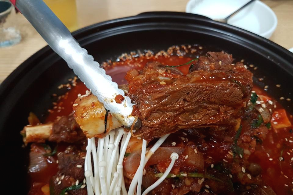 그렇게 기본찬과 함께 소주 한잔 마시고 있으니 소갈비찜이 등장합니다 뚝배기 같은 그릇에 담겨 나왔는데 둘이 먹기에 충분한 양이었어요 집게로 살짝 집어서 자르니 뼈와 고기가 분리도 잘 됩니다