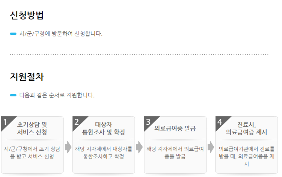 > 대상자 통합조사 및 확정을 거칩니다> 해당 지자체에서 의료급여증을 발급> 병의원등 진료를 받을떄 의료급여증 제시로진료비 면제부터 감면혜택까지 받게됩니다