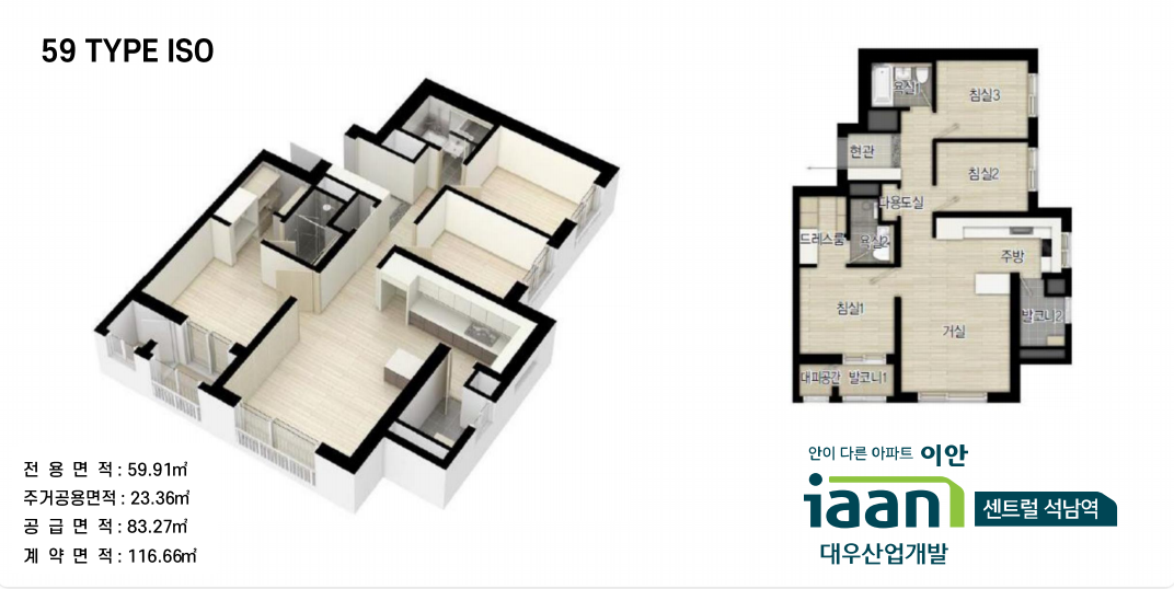 인천 석남동 아파트 이안 센트럴 석남역은 59type, 69type, 84type의 선호도가 가장 높은 중소형 평수로 구성되어 있으며 모든 평형대가 방 3개, 화장실 2개로 이루어져 있습니다.