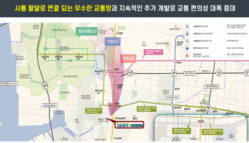 사통팔달로 연결되는 우수한 교통망과 지속적인 추가개발로 인해서 교통 편의성이 증대되는 입지특성을 갖추고 있음은 물론이고 서울5호선 검단연장과 서울7호선 석남,청라연장사업, 서울 9호선 공항철도 직결,인천1호선 검단연장, 인천2호선 검단, 김포, 일산연장사업등이 예정되어 있어 매우 막강한 교통호재를 갖추게 됩니다.