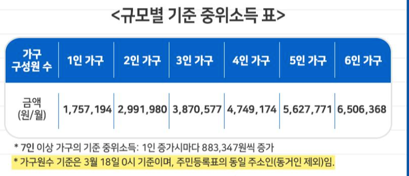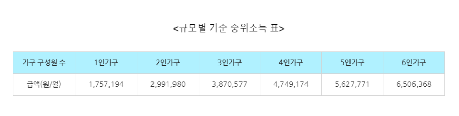 가구원 수에따라 또 중위소득 금액이 달라집니다 - ex. 엄마, 아빠, 아이 한명, 총 3인으로 이루어진 가정의 경우