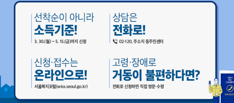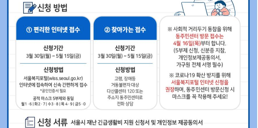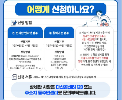 3월30일부터 주소지 주민센터에 방문신청과 서울 복지포털을 통한 인터넷 신청이 모두 가능합니다