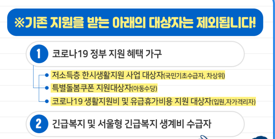 중위소득 100% 이내에 드는 서울시민이라도 이미 코로나19 정부지원 혜택을 받고 있는 가구(저소득층 한시생활지원 사업 대상자, 특별돌봄쿠폰 지원대상자, 생활비지원 및 유급휴가비용 지원 대상자), 실업급여 수급자, 국가 및 서울형긴급복지 수급자, 일자리사업 참여자(사회공헌, 어르신, 뉴딜), 청년수당 수급자 등 다섯가지 항목에 해당되는 시민은 이번 지급대상에서 제외된다.