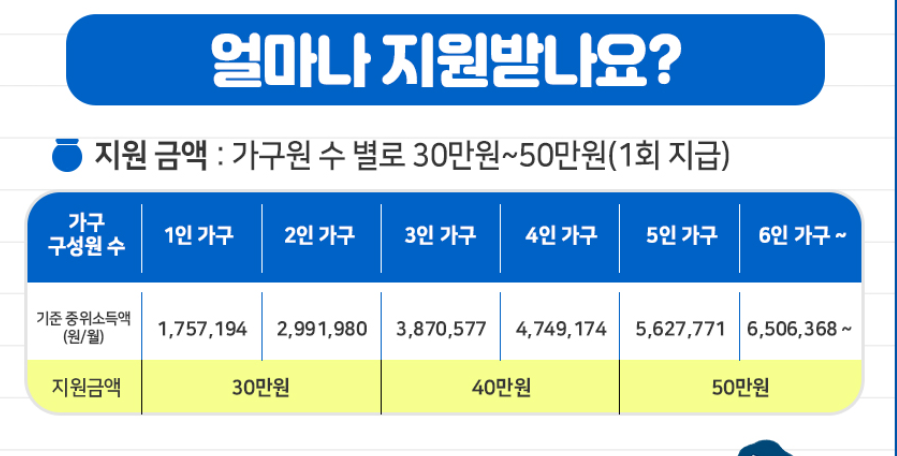 1~2인 가구 : 30만원 / 3~4인 가구: 40만원 / 5인 이상가구: 50만원으로 최대 지원금액은 가구당 50만원입니다