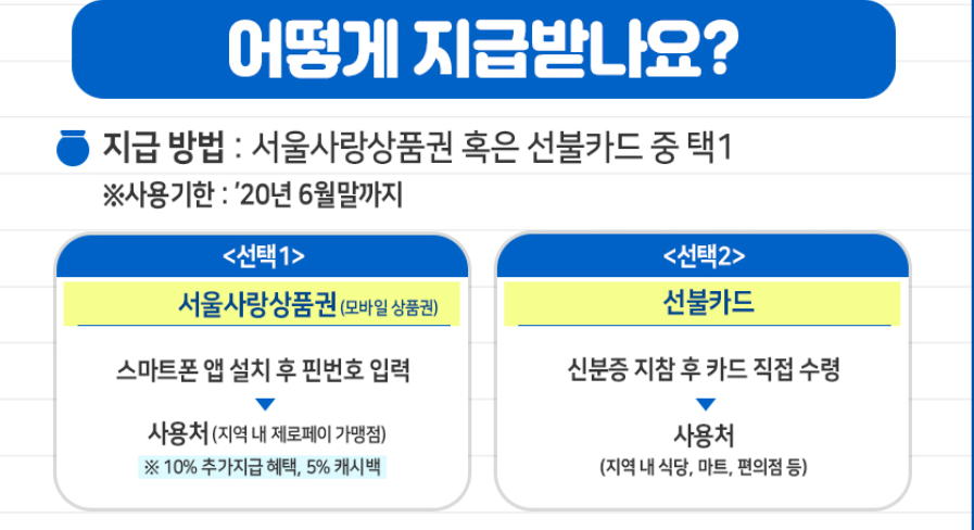 지급은 현금이 아닌, 서울사랑상품권 또는 선불카드로 지급됩니다 따라서 별도의 현금지급은 하지 않습니다