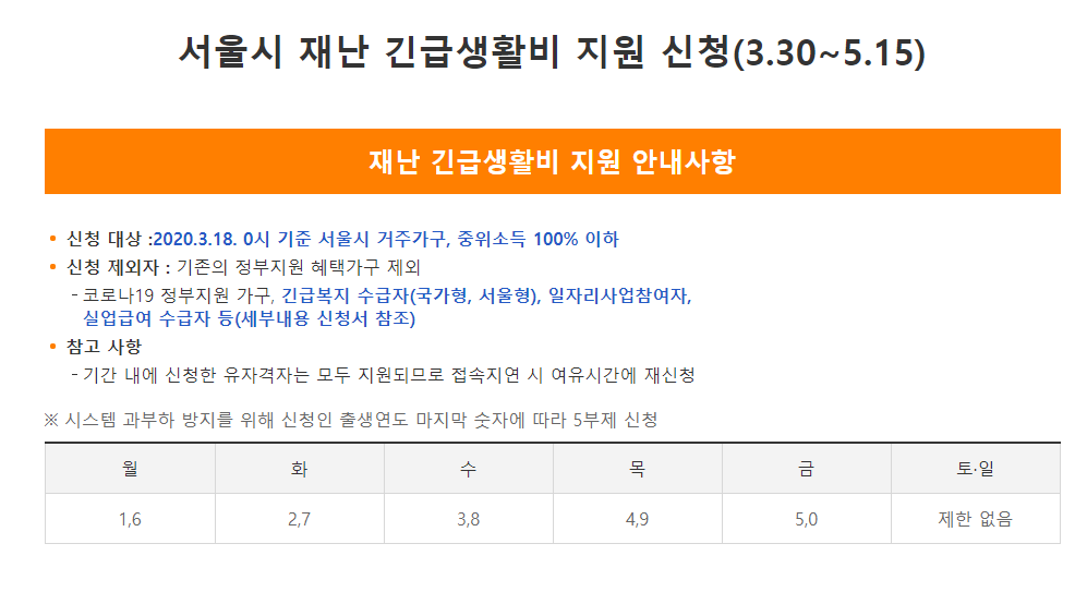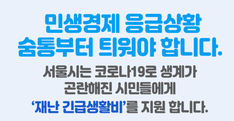 서울시 재난 긴급생활비 지원 신청(3.30~5.15) 재난 긴급생활비 지원 안내사항 신청 대상 :2020.3.18. 0시 기준 서울시 거주가구, 중위소득 100% 이하 신청 제외자 : 기존의 정부지원 혜택가구 제외 코로나19 정부지원 가구, 긴급복지 수급자(국가형, 서울형), 일자리사업참여자, 실업급여 수급자 등(세부내용 신청서 참조) 참고 사항 기간 내에 신청한 유자격자는 모두 지원되므로 접속지연 시 여유시간에 재신청 ※ 시스템 과부하 방지를 위해 신청