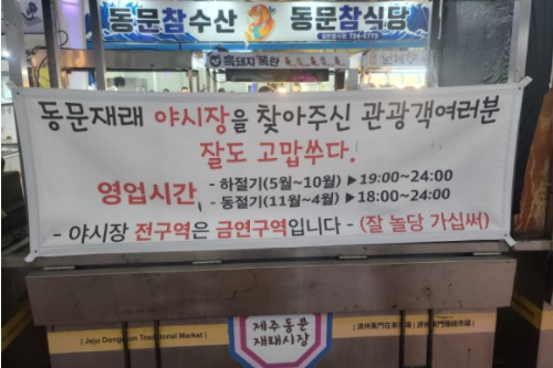 동문재래시장 야시장 영업시간은 하절기 5월-10월 19:00-24:00이며 동절기 11월-4월 18:00-24:00입니다
