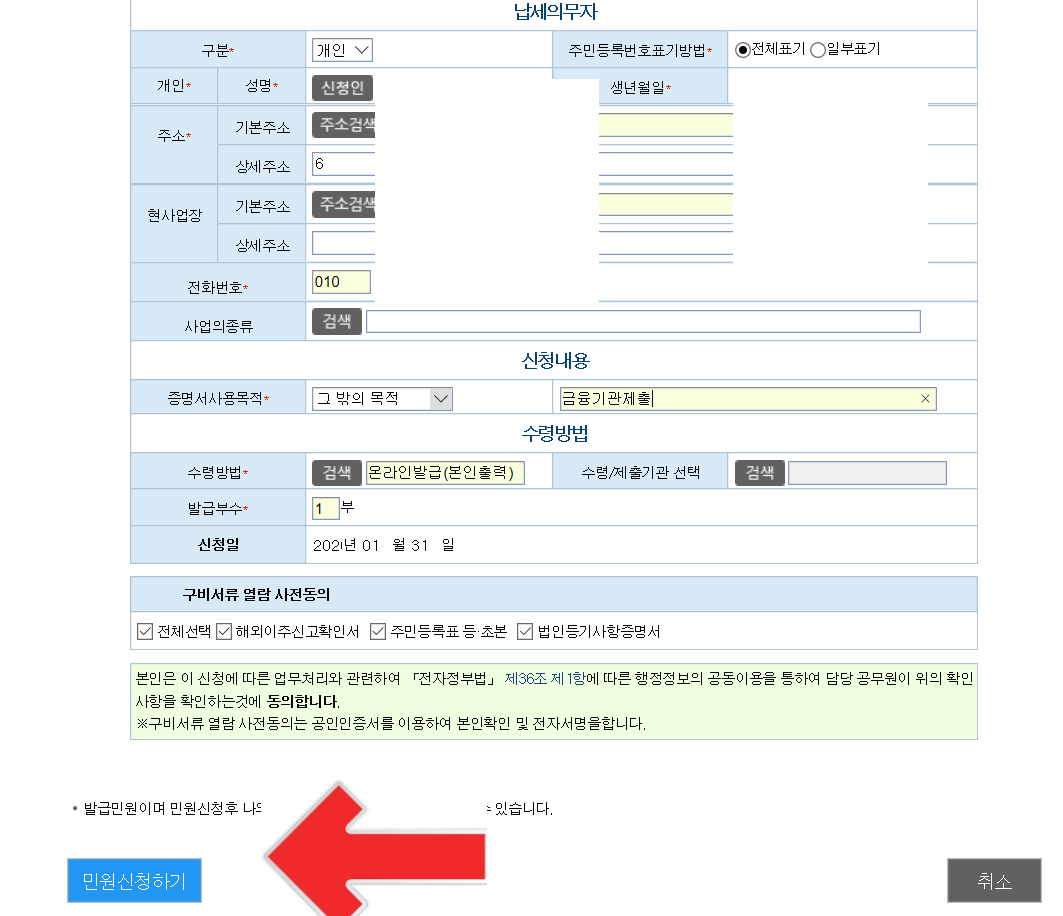 주소입력까지 다 마치셨다면 사용목적을 선택해 주시고 신청내용을 작성해주시면 됩니다 저는 금융기관제출이라고 작성했습니다 여기까지 하셨다면 이제 다끝나셨습니다 맨하단 민원신청하기를 클릭해주세요
