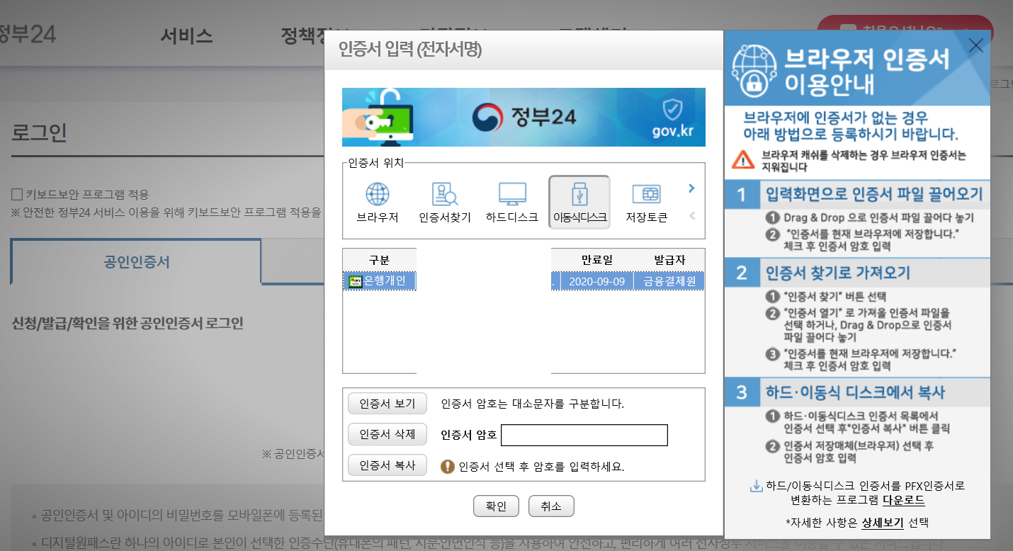 인증서 암호를 누르신뒤 로그인을 진행해 주세요 지난번에도 말씀 드렸지만 공공장소에서 공인인증서 저장을 하셨다면 꼭 폐기하셔야 한다는점