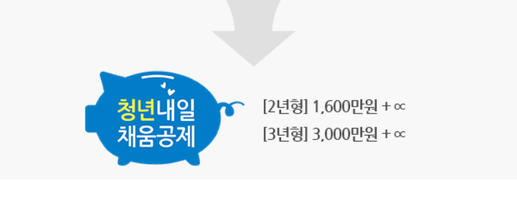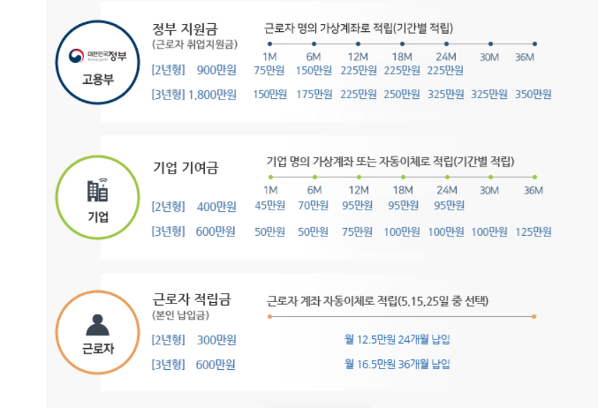 2년형 - 2년간 청년 본인이 300만원 ( 매월 12만 5000원) 을 적립하면 기업 (기업기여금 400만원) 과 정부 (취업지원금 900만원)가 공동적립하여 총 1600만원과 이자를 수령합니다