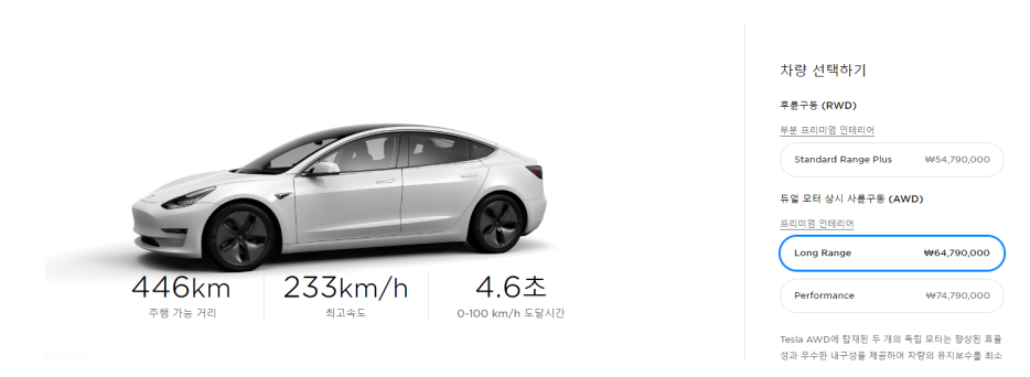 기존 모델3 롱레인지보다 49km를 더 주행할 수 있습니다 특히 저온 기준 주행거리는 기존보다 165km나 증가했다는 점이 돋보이네요