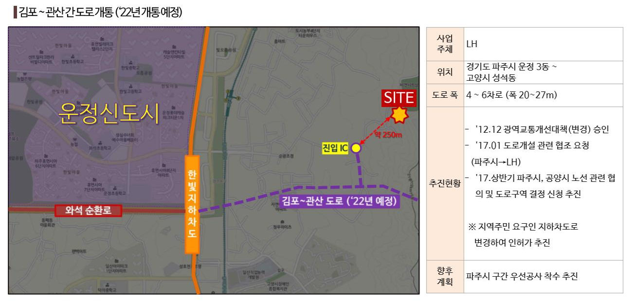 서울~ 문산 고속도로 2020년 개통 예정 제2외곽순환도로 2018년 김포~파주 착공등 주요 핵심 지역 접근성 확보로 광역 교통망 형성- 신도시 기능 향상 A급 핵심권역 부상전망