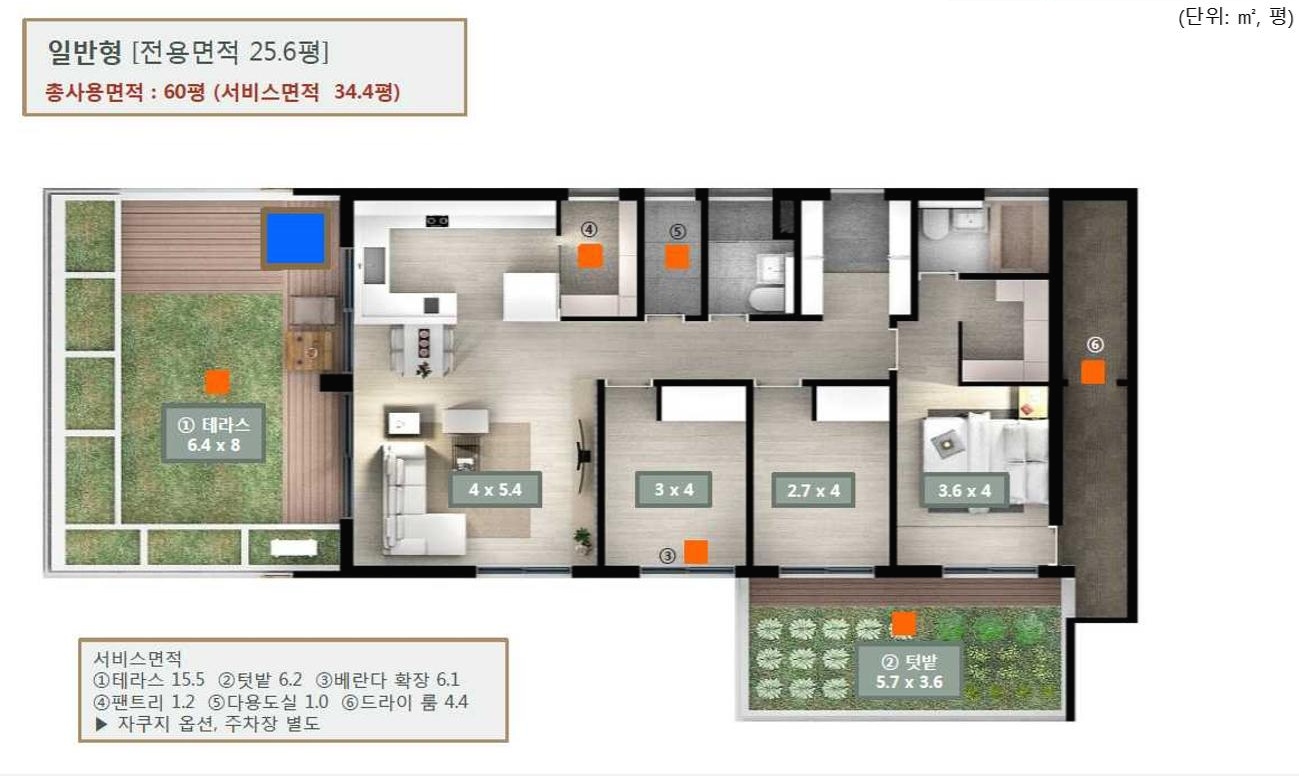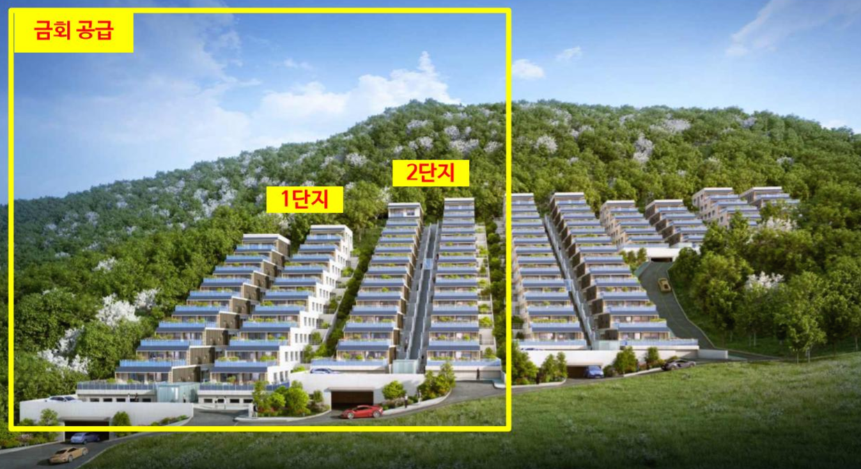 황룡산의 천연 지형을 활용한 국내 최초 자연형 테라스 하우스 단독주택의 여유와 아파트의 편리성을 접목시킨 장점이 돋보입니다 세대별 테라스 15.5평 텃밭 6평 유리경사형 엘리베이터 전타입 남서향으로 구성되어 있습니다