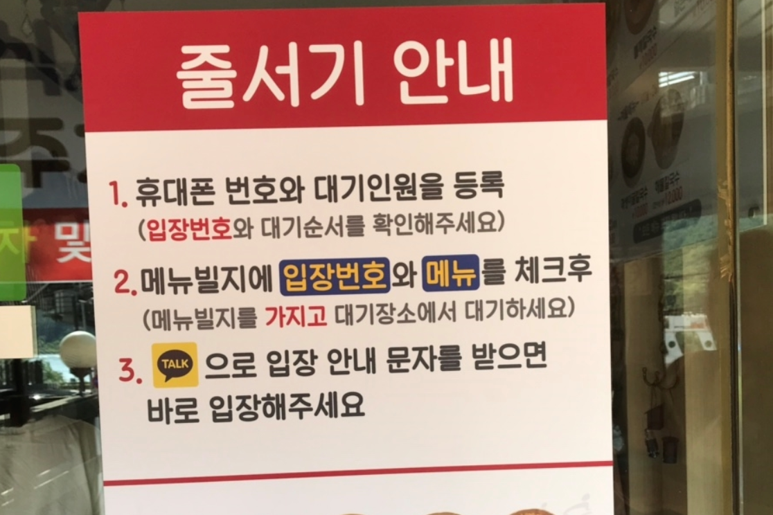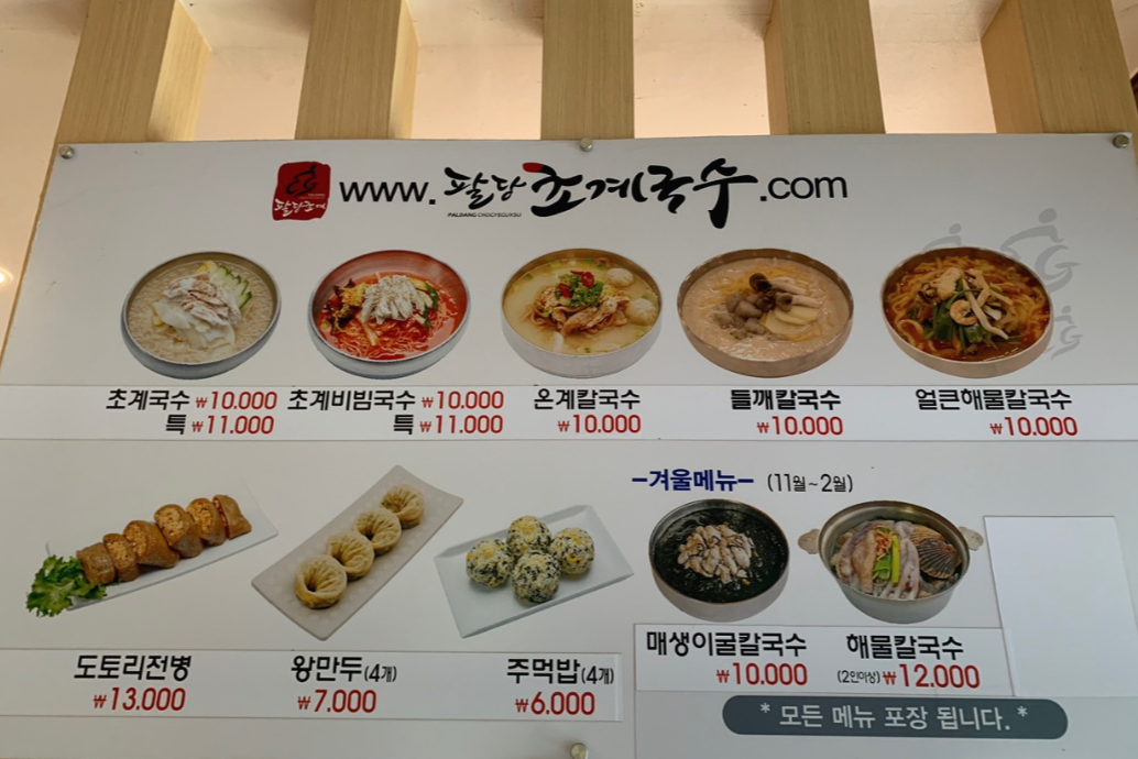 우선 웨이팅 기계가 생겼습니다 테이블 회전이 빠른편임에도 불구하고 사람이 많을때는 기본 30분이상은 기다려야 한다고 했습니다 식사외 주차시 견인한다는 문구도 있었습니다 거기까지 가서 식당에 주차하고 다른곳에 가시는 분이 과연 있을까?? 의아했습니다 그리고 가격이 모두 만원으로 올랐습니다 특사이즈는 11000원입니다 그외 도토리전병은 13000원 왕만두 7000원 주먹밥 6000원 매생이굴칼국수 10000원 해물칼국수는 2인이상주문가능하고 1인 12000원입니다 이건 예전에도 그랬는지 정확히 기억이 나지 않지만 앞접시 가위 김치 물은 모두 셀프입니다
