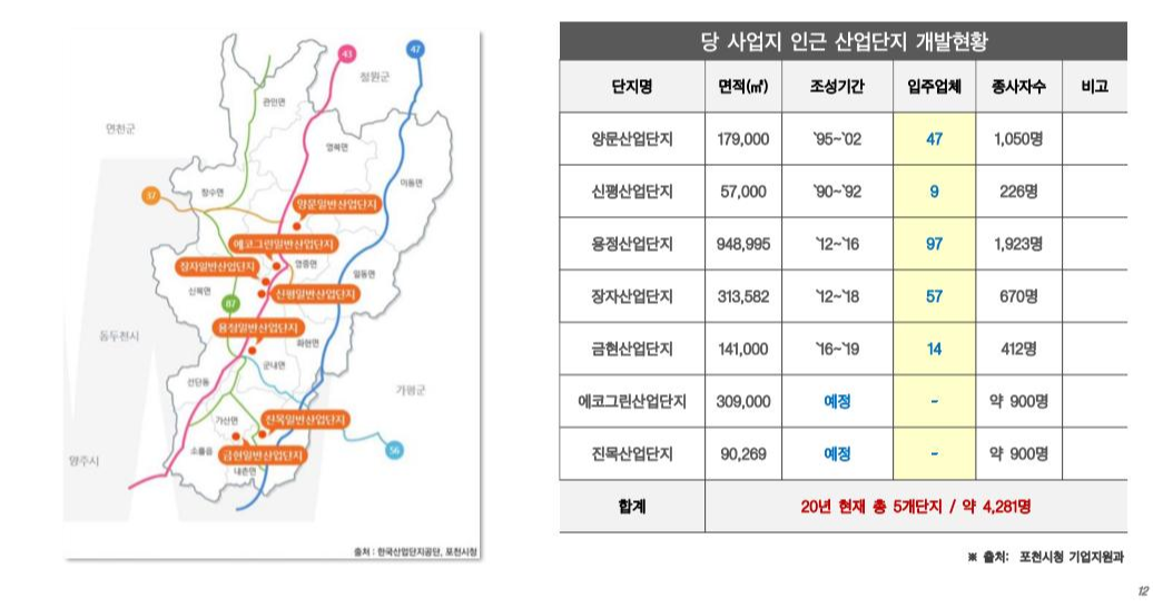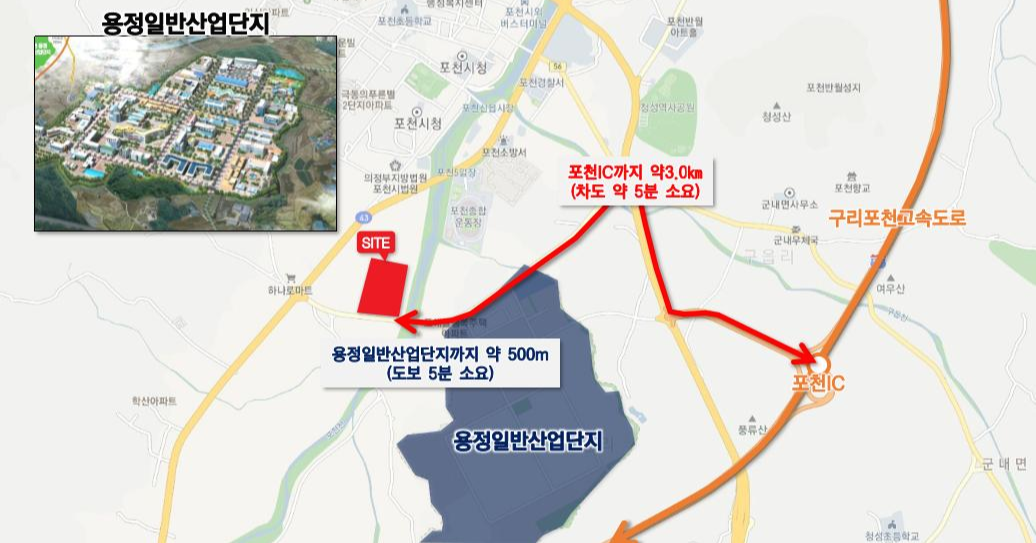 현재 포천 5개 산업단지에서 약 4000명의 종사자 근무중 조성 완료시 신규 일자리 창출 및 지역 내 소비활동 증가로 지역경제 활성화 예상 / 용정일반 산업단지 도보 5분거리로 직주근접 가능!