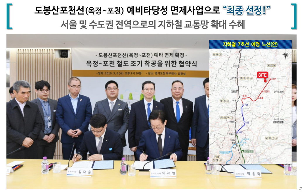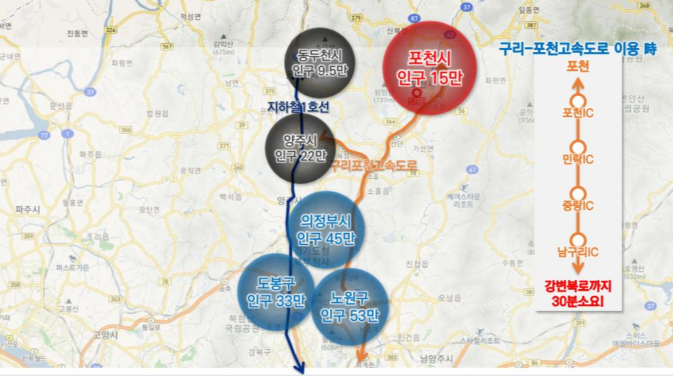 구리~포천 간 고속도로를 이용하면 서울로 진입이 용이하며 예정되어 있는 옥정~포천 간 제2외곽순환 고속도로와 7호선 연장 사업이 완료되면 강남까지 30분대 진입 지하철로는 6정거장만에 도달하게 됩니다