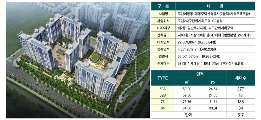 지하1층~지상20층, 6개동아파트 총517세대 / 전용면적 59㎡, 75㎡, 84㎡ / 일반분양 245세대