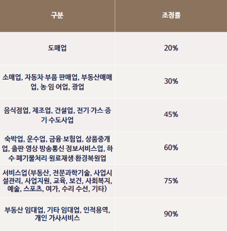 업종별조정률은 아래 표를 참고하시면 됩니다